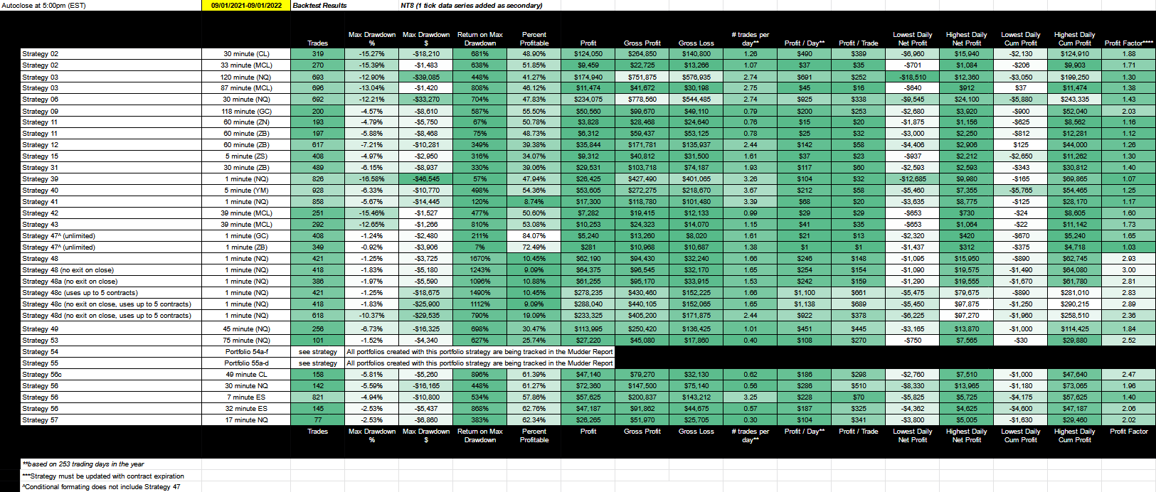 There is no guarantee that these strategies will have the same performance in the future. Some may perform worse and some may perform better. We use backtests to compare historical strategy performance. Backtests are based on historical data, not live data. There are no guarantees that this performance will continue in the future. Trading futures is extremely risky. If you trade futures live, be prepared to lose your entire account. We recommend using our strategies in simulated trading until you/we find the holy grail of trade strategy.