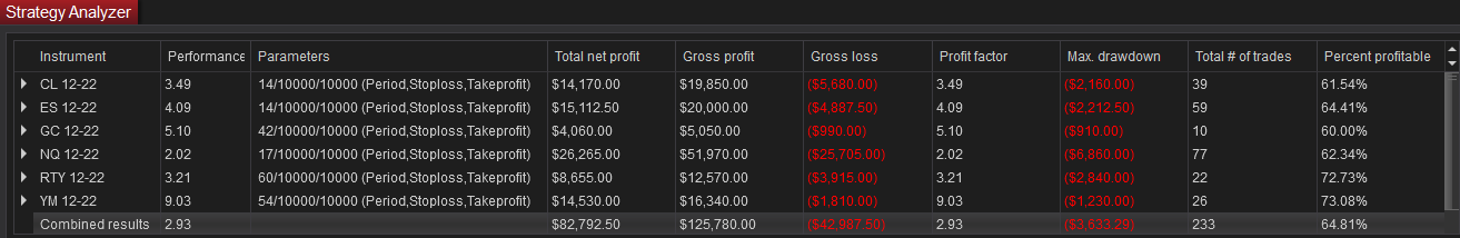 This strategy uses 6 futures contracts (CL, ES, GC, NQ, RTY, & YM) to net a profit of $82K for the year.