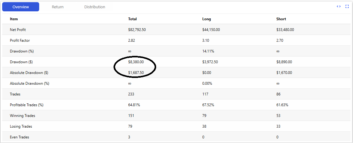 As you can see from the chart below, the cumulative drawdown for this portfolio is actually $8,380, not $3,633. That‘s with all 6 contracts running at the same time. So the most the account balance falls from its high is $8,380. This suggests you want to have at least $10K in the account at all times. Additionally, the lowest the portfolio went below $0 profit is $1,687. So if this strategy was started on an account with a balance of $50K, the lowest the account balance would have gone is $48,313. Put yet another way, based on a one year backtest, this portfolio strategy made a net profit of $82K, and never lost more than $1,687 (absolute drawdown) for the entire year (11/1/2021 - 11/1/2022).