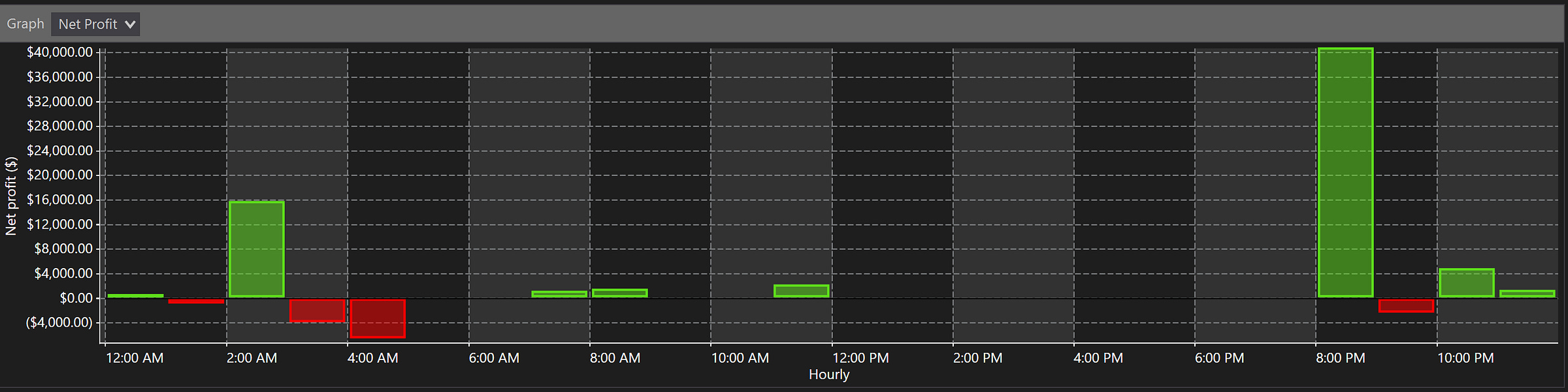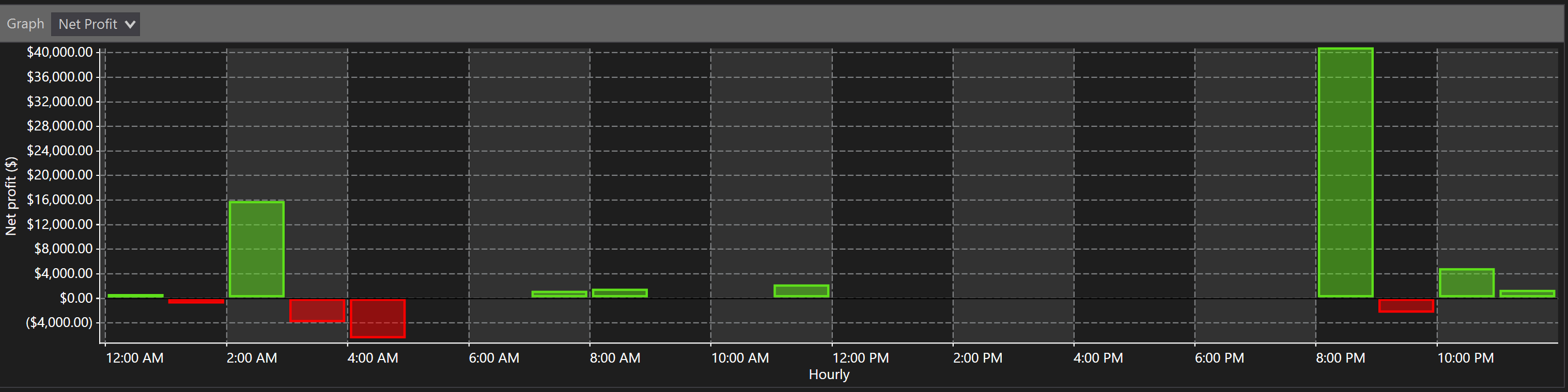 These aren’t the best results, but as you can see from the chart below, the bulk of trades enter in the 12am and 7pm hour. Restricting trade entry to these time periods would definitely increase the profit factor. And, there are over 300 trades taken for the strategy throughout the year, regardless of the time interval, so you have some room to play with.