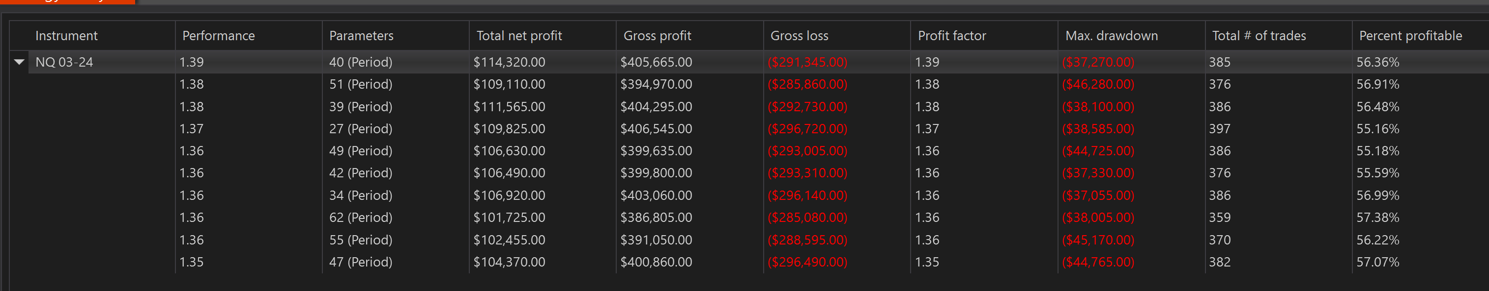 These are the results for AutoStrategy 94. Granted, these are not the best results, but profit factor has a low standard deviation regardless of time interval—there’s an edge there.