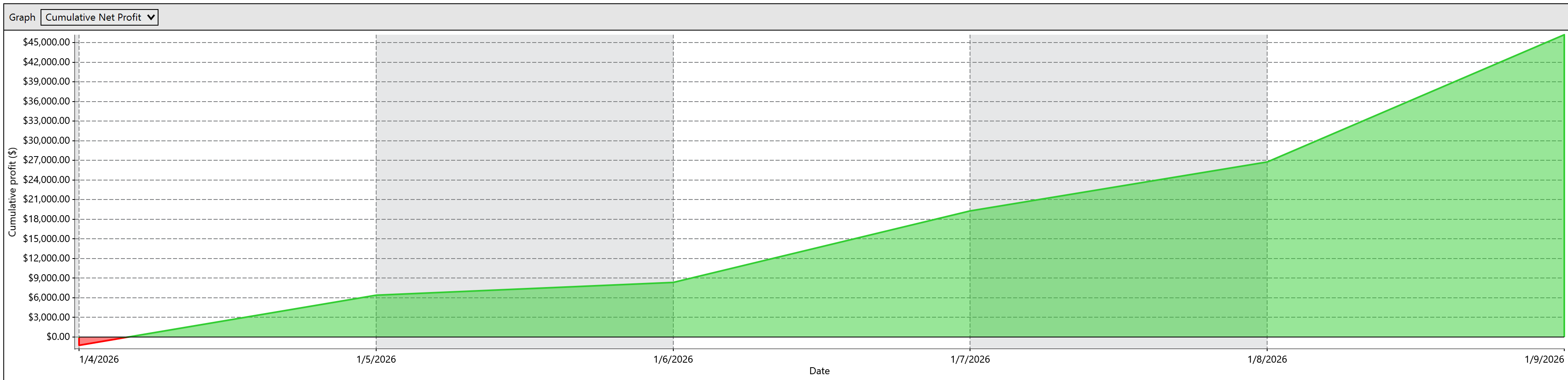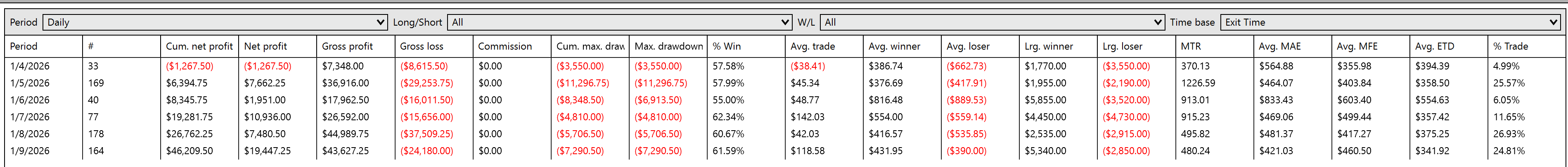 In total, the portfolio is up $46K on 661 trades. Here’s a daily breakdown:
