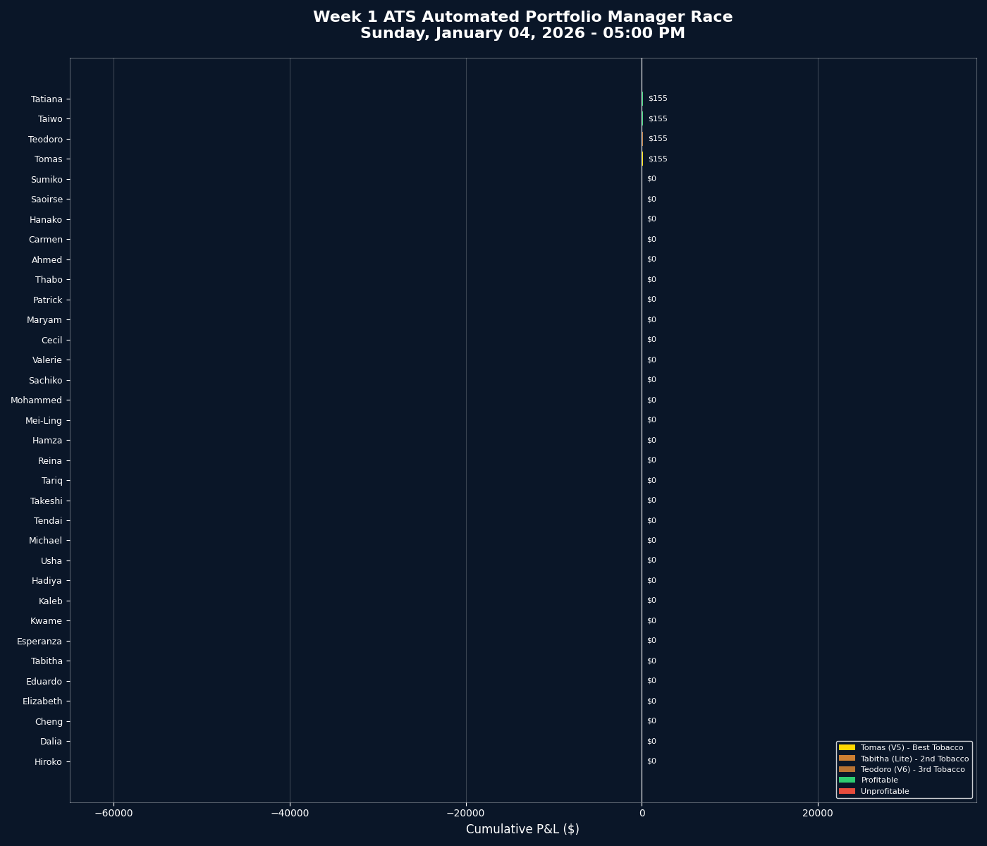 Week 1 gave us Cecil in the lead, but one week proves nothing. The real story will emerge over months of data. That’s what makes this interesting. We’re not backtesting hypotheticals, we’re running a live tournament and letting the results speak for themselves.