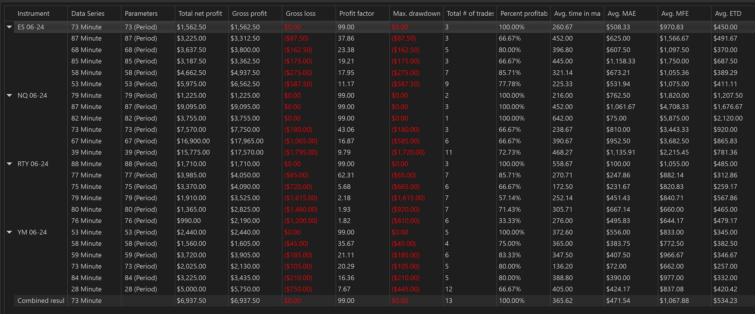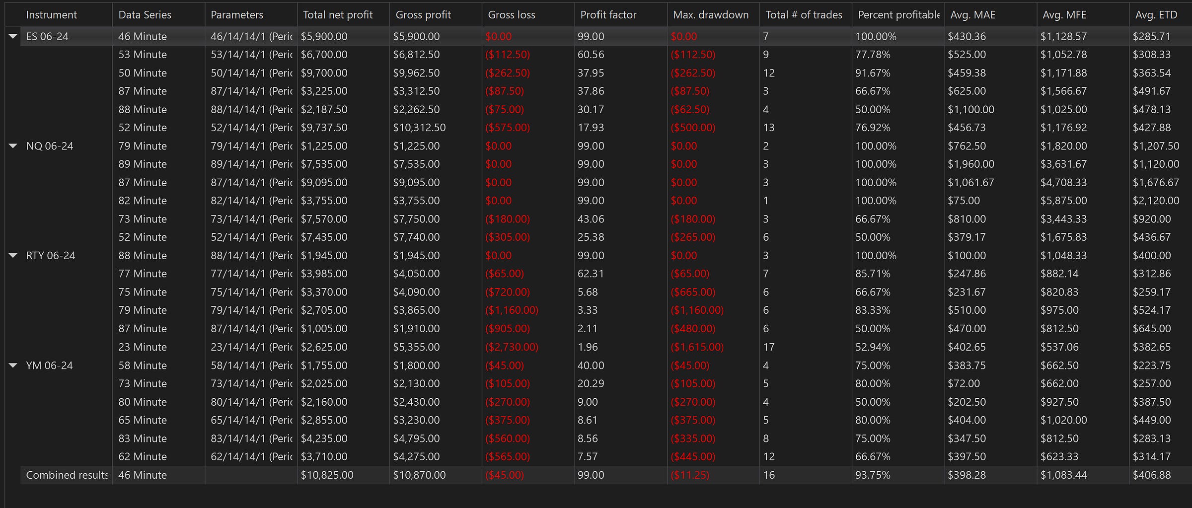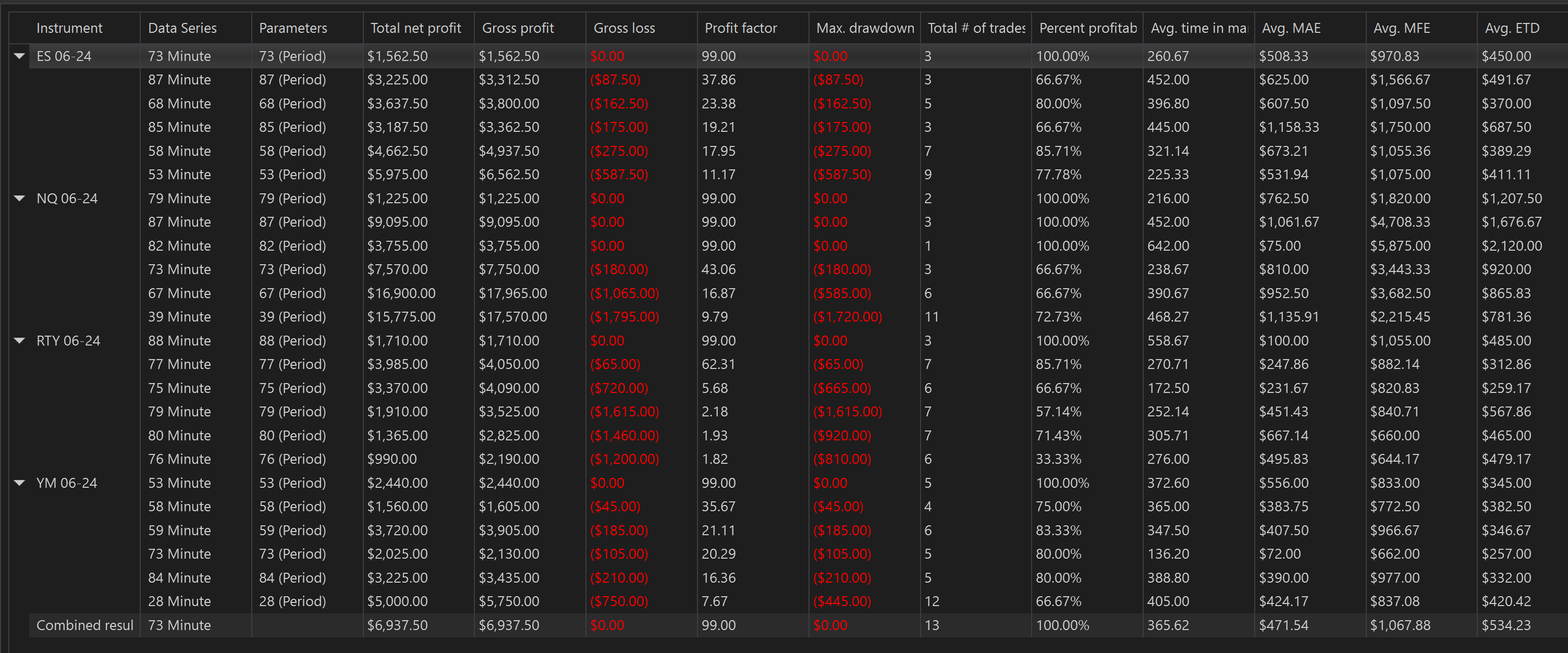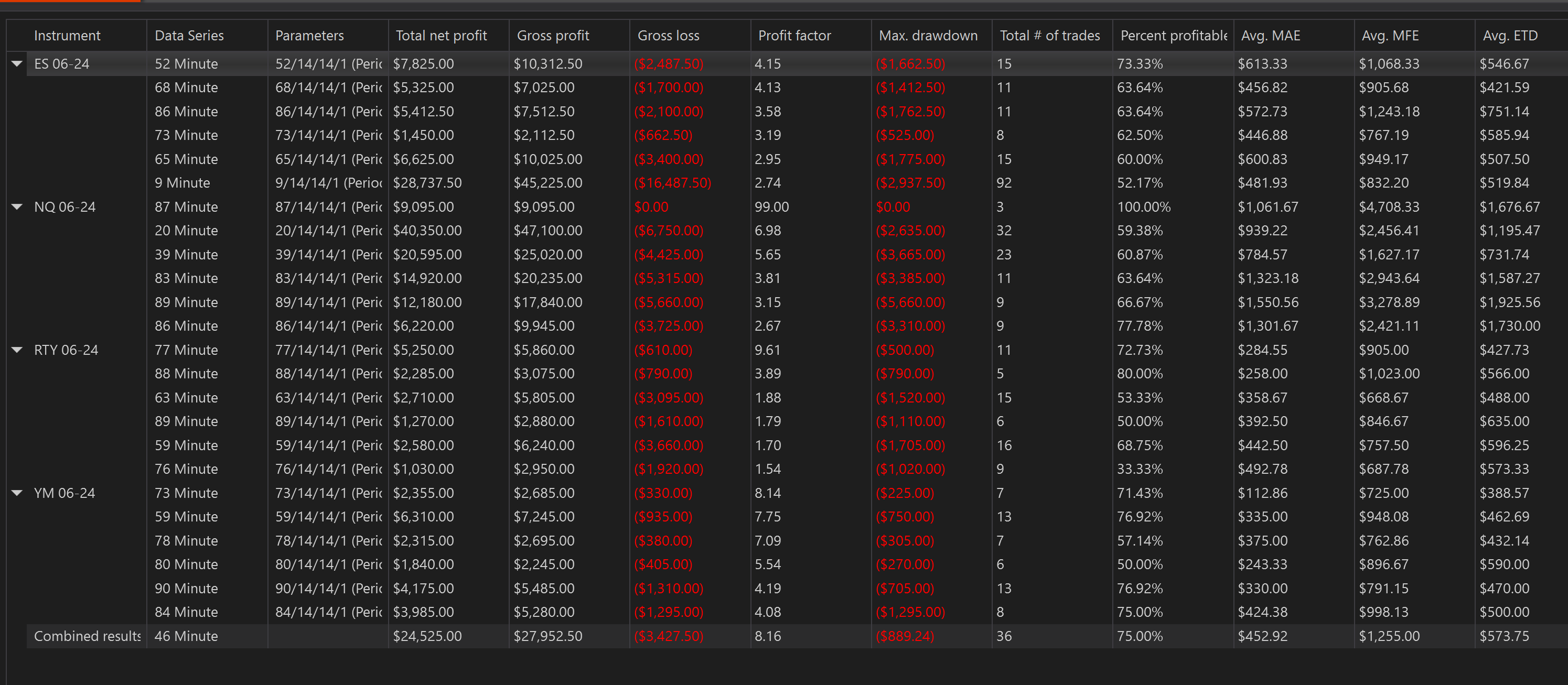 As an example, I “re-engineered” the following strategies and ran them through a data series optimization from January 1, 2024 through May 14, 2024. These are the top 6 results from equity futures contracts ES, NQ, RTY, YM. I’ll be running the top three from each in the forward test.